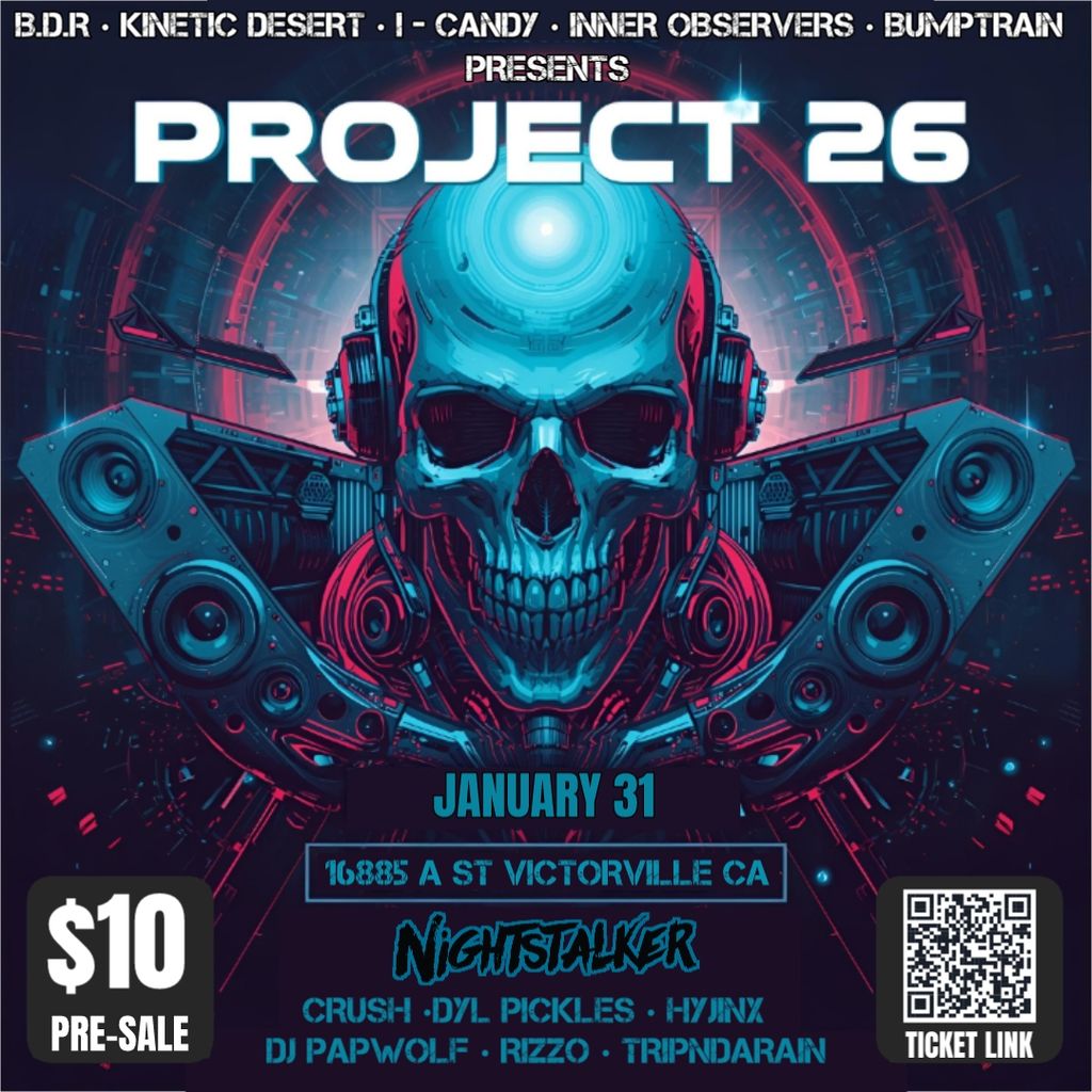 The countdown is on! Project 26 is incoming January 31st with Nightstalker at the forefront. This is a massive collaboration between Kinetic Desert , B.D.R , Inner Observers , I-Candy Ent. , and Bump Train at Hesperia Entertainment Hall. This massive 2-story venue will erupt with DNB vibes till 3am, featuring world-class sound, lighting, and lasers